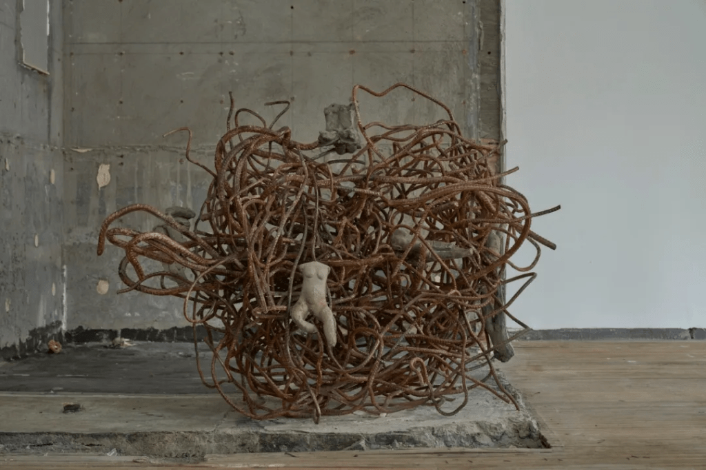 同样是从都市和自然场所中汲取形式,用雕塑探讨人与城市之间、与自然之间的微妙关系,艺术家于吉持续多年的系列作品“石肉”由代表人类形态的具象混凝土雕塑组成,不完整的肉身通常没有头和手脚,由铁骨架支撑或以钢筋缠绕,粗砺的质感中透露出肉体的缺憾。