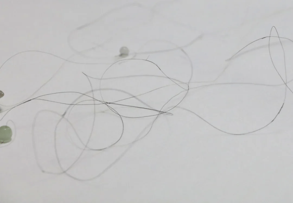艺术家张一也曾收集不同人的头发,连成一根细线,串联起珠宝,散布于展厅之中。纤细、不显眼的发丝肩负起真金白银的身外之物,形成锁链,仿若一则“脆弱宣言”,提示出“命悬一线”的易碎与偶然。